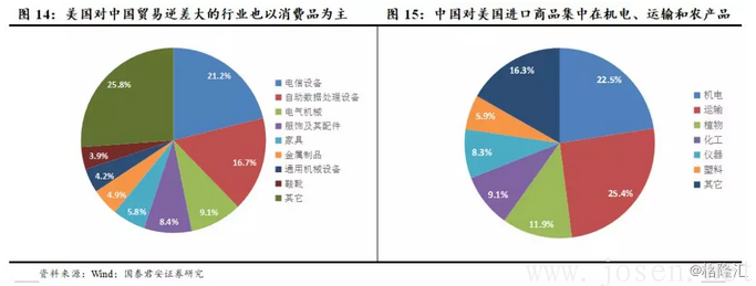 ● 美國對中國貿易赤字的前十大行業占比達85%,主要包括電信設備、自動數據處理設備、服裝及衣著附件、電力機械、家具、金屬制品、鞋靴、通用機械設備,占比分別為21%、17%、9%、8%、6%、5%、4%和4%(圖14)。