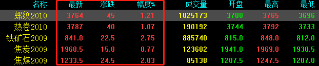 期螺漲45收?qǐng)?bào)3764,期卷漲40收?qǐng)?bào)3787,鐵礦石漲22.5收?qǐng)?bào)841,焦炭漲15收?qǐng)?bào)1960.5,焦煤漲24.5收?qǐng)?bào)1233.5。