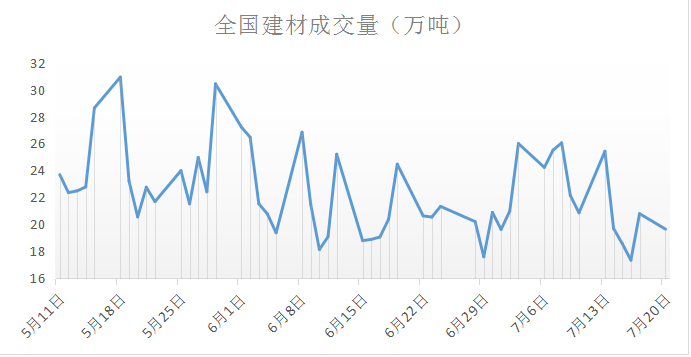 日內(nèi)期貨反彈,對(duì)現(xiàn)貨報(bào)價(jià)帶來(lái)提振,但市場(chǎng)成交整體偏謹(jǐn)慎,主要集中在低價(jià)資源。從最近全國(guó)建材成交量來(lái)看,近一周均在20萬(wàn)噸左右徘徊,雨季對(duì)下游開(kāi)工的影響依然存在。