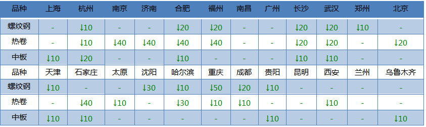 螺紋鋼24個(gè)市場(chǎng)中12個(gè)市場(chǎng)下跌10-50, 20mmHRB400E平均價(jià)格3782元/噸,較上個(gè)交易日下調(diào)10元/噸。