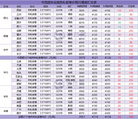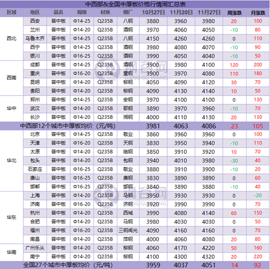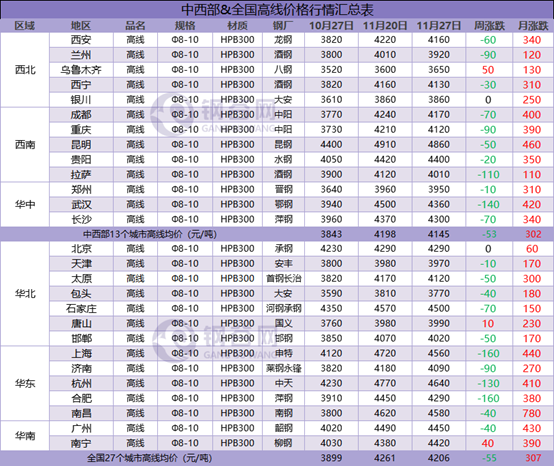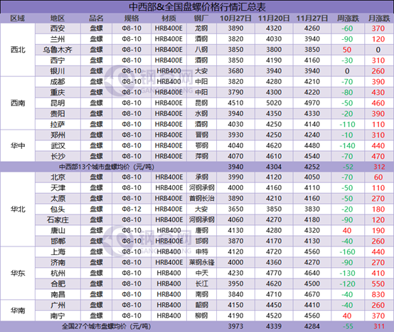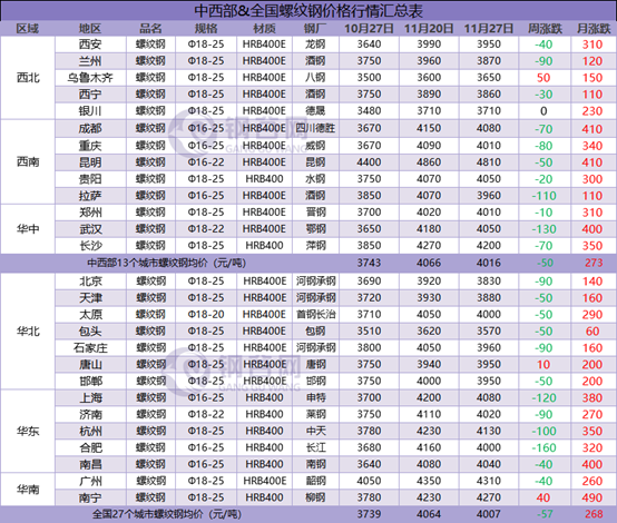 據(jù)鋼谷網(wǎng)數(shù)據(jù)監(jiān)測,本周全國主要城市鋼材市場價(jià)格盤整運(yùn)行,調(diào)整空間10-160元/噸,板材強(qiáng)于長材。截止11月27日,全國27個(gè)城市螺紋鋼均價(jià)4007元/噸,較上周跌57元/噸;全國27個(gè)城市高線均價(jià)4206元/噸,較上期跌55元/噸;全國27個(gè)城市盤螺均價(jià)4284元/噸,較上期跌55元/噸;全國27個(gè)城市熱軋板卷均價(jià)4134元/噸,較上周漲20元/噸;全國27個(gè)城市中厚板均價(jià)4051元/噸,較上期漲14元/噸。