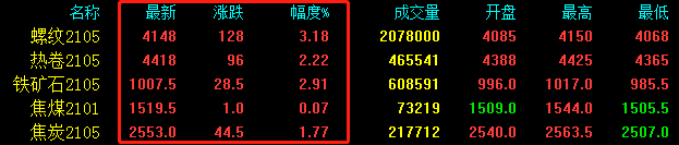 期鋼拉漲,期螺沖破4100,上漲128收報4148,期卷上漲96收報4418,鐵礦石上漲28.5收報1007.5,焦煤上漲1收報1519.5,焦炭上漲44.5收報2553。