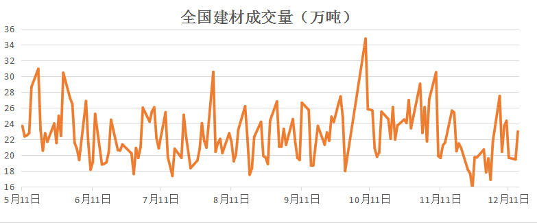 近一周全國建材成交量均處于25萬噸以下,需求轉弱的跡象較為明顯。從今日市場成交來看,相對謹慎,鋼需用戶逢低采購,且主要集中在缺貨規格,多數低量采購。由于北方工地陸續停工,南方低溫帶來影響,臨近年關,建材淡季需求會更加明顯。
