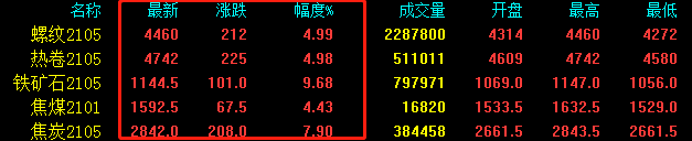 期鋼開盤拉漲,隨后漲停。期螺上漲212收報4460,期卷上漲225收報4742,鐵礦石上漲101收報1144.5,焦煤上漲67.5收報1592.5,焦炭上漲208收報2842。