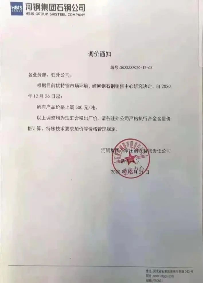 焦炭9輪上漲后,山東、山西、河北多地焦化企業提漲50元/噸,自12月22日零時期實施。包括山東省內濰坊、濱州、德州、濟寧、棗莊、菏澤、日照、泰安等各地焦炭生產企業冶金焦出廠價格提漲,河北大型焦企、介休市昌盛煤氣化焦炭價格、襄礦集團沁縣華安焦化焦炭價格均在原價基礎上提漲50元/噸。原料端強勢上漲進一步增強鋼廠挺價意愿。