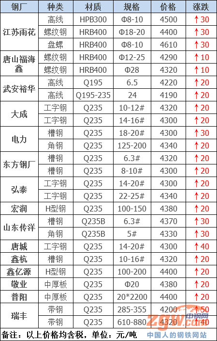 據(jù)數(shù)據(jù)監(jiān)測,今日共26家鋼廠調(diào)價(jià),其中漲幅最高為瑞豐帶鋼,調(diào)價(jià)幅度50元/噸,具體調(diào)價(jià)明細(xì)如下: