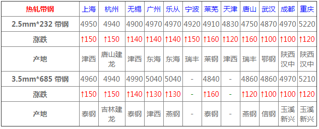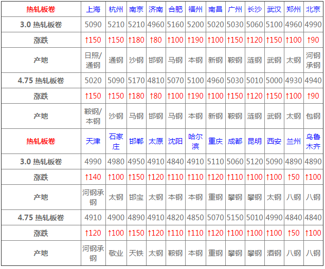 今華東地區熱軋板卷寬幅上調,幅度100-170元/噸,期鋼疊加原料端雙雙走高,帶動市場提漲情緒,上海5020-5030,無錫5030-5040,杭州512;華中地區大幅拉漲,長沙5050-5060,武漢5000-5020,鄭州4900;