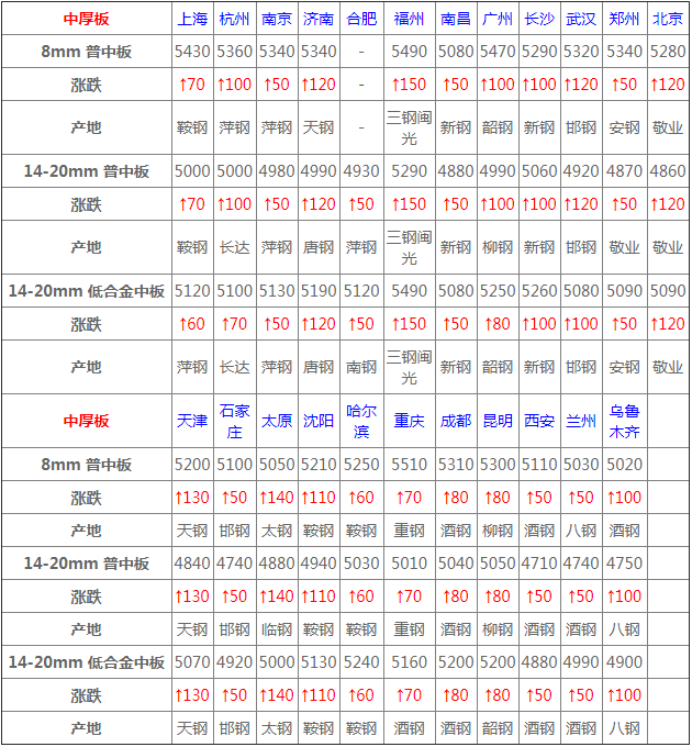 今華北中板價格暴力拉漲,幅度100-140元左右,截止午前主流唐山中板基價4890元/噸,天津中板16-20mm天鋼4850元/噸,武安14-25mm普陽/冀鋼4830-4850元/噸,個別高位4900元/噸。