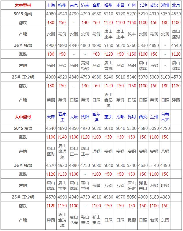 今型材市場大幅上調。近期原料市場利好因素有所增多,受成品材、鋼坯價格連續上調帶動,整體心態明顯好轉,貿易商詢盤增多。但隨著鋼價逐步抬高,下游需求釋放并不及預期,市場恐高氛圍愈漸濃厚。預計短期型材市場價格將窄幅上漲運行。