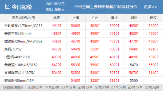 隨著兩會即將召開,各地限產管控升級,原料市場供應偏緊未改善,加上鋼企出廠價格支撐,市場價格跟隨期貨大幅拉漲,由于前期鋼價漲幅加大,市場價格過高,使得終端商戶接受有限,實際成交一般,但隨著金三旺季到來,下游項目逐漸開展,市場需求陸續釋放,預計明日鋼材價格將繼續上漲運行。
