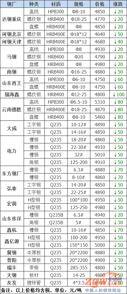 據數據監測,今日共25家鋼廠調價,其中跌幅最大為福海鑫螺紋鋼,調價幅度100元/噸,具體調價明細如下: 鋼廠調價 江蘇雨花建材價格平穩 山西高義建材價格平穩 山西宏達建材價格平穩 山西美錦建材價格平穩 馬鋼建材下調20元/噸 云南德勝建材下調80元/噸 達鋼重慶建材下調20元/噸 南鋼建材價格下調50元/噸 山東西王建材下調60元/噸 河鋼北京建材下調50元/噸 河鋼天津建材下調40元/噸 福海鑫螺紋鋼下調100元/噸 電力型材下調50元/噸 鑫杭槽鋼下調70元/噸 弘泰工字鋼下調50元/噸 大成工字鋼下調50元/噸 宏潤H型鋼下調50元/噸 東方鋼廠槽鋼下調70元/噸 山東傳洋型材下調20-30元/噸 鑫億源H型鋼下調50元/噸 天鋼板材下調50元/噸 瑞豐帶鋼價格下調50元/噸 冀鋼板材價格下調20元/噸 普陽中厚板價格下調30元/噸 友發鍍鋅管價格下調50元/噸 鋼廠調價占比 下調21家,占比84%,調價幅度20-100元/噸。 平穩4家,占比16%。 鋼廠檢修信息 1、3月鞍山源鑫螺紋產線復產信息 鞍山源鑫鋼鐵有限公司計劃于3月11日凌晨復產1條螺紋產線,日均增加產量約1200噸。 2、3月威鋼(釩鈦科技)高爐檢修信息 威鋼(釩鈦科技)正式從2021年3月9日起對6#1750m3高爐進行38天檢修,日均影響鐵水產量約0.5萬噸,合計影響鐵水產量約19萬噸。 重要行業信息 1、1-2月我國鐵礦石進口均價144.5美元/噸 同比增長56.6% 根據海關統計數據,2021年1-2月,我國進口鋼材239.5萬噸,同比增加35.5萬噸,增長17.4%;進口均價1095.6美元/噸,同比增加77.8美元/噸,增長7.6%。2021年1-2月,我國進口鐵礦石18150.6萬噸,同比增加481.1萬噸,增長2.8%;進口均價144.5美元/噸,同比增加52.2美元/噸,增長56.6%。 2、世界鋼鐵協會啟動鋼鐵工業水資源管理調研項目 為了全面了解全球鋼鐵工業在用水管理方面的經驗,展示鋼鐵行業負責任的水資源管理實踐,世界鋼鐵協會于2021年2月正式啟動水資源管理調研項目。在為期三個月的調研工作中,項目組計劃選取20家左右的鋼鐵企業進行調研工作,本次調研以定性內容為主,將涵蓋所有類型的鋼廠和各種水資源挑戰,包括水資源綜合利用、水資源短缺、水資源質量挑戰、污水零排放、用水規章制度等。 3、2月乘用車市場零售達117.7萬輛 同比增371.9% 零售:2021年2月乘用車市場零售達到117.7萬輛,同比受到疫情影響最大的2020年2月增長了371.9%,同比2019年2月增長0.3%。2月零售環比1月下降45.5%,這相對歷年的平均環比增速基本持平。由于今年春節較晚,加之新能源車火爆,2月車市有較好的增長基礎,傳統車市場需求并不火爆。 4、2月CPI同比下降0.2% PPI同比增長1.7% 中國2月CPI同比下降0.2%,預期下降0.3%,前值下降0.3%。中國2月PPI同比增長1.7%,預期增長1.5%,前值增長0.3%。 5、央行開展100億元逆回購操作 實現零投放零回籠 3月10日,央行公開市場開展100億元7天期逆回購操作,今日有100億元逆回購到期,實現零投放零回籠。