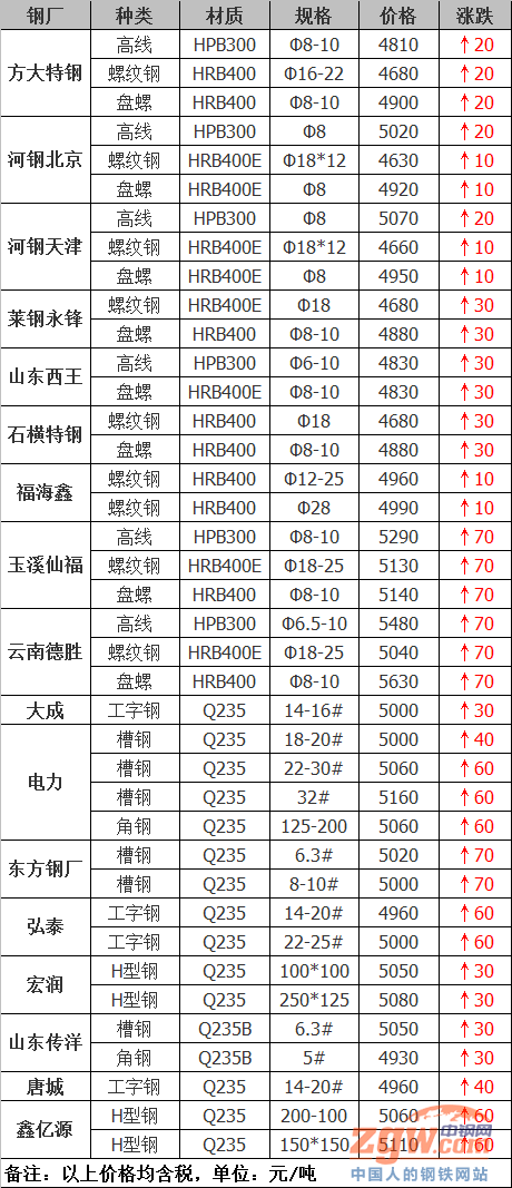 據數據監測,今日共26家鋼廠調價,其中漲幅最高為云南德勝建材,調價幅度70元/噸,具體調價明細如下: