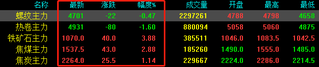 期鋼午后轉(zhuǎn)跌,期螺下跌22收?qǐng)?bào)4701,期卷下跌80收?qǐng)?bào)4931,鐵礦石上漲40收?qǐng)?bào)1070,焦煤上漲43收?qǐng)?bào)1537.5,焦炭上漲25.5收?qǐng)?bào)2264。