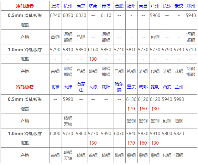 今全國(guó)冷軋市場(chǎng)漲跌穩(wěn)均現(xiàn),幅度30-140左右,市場(chǎng)部分規(guī)格存缺貨現(xiàn)象,商家為促進(jìn)出貨,價(jià)格上實(shí)單有一定優(yōu)惠,整體成交一般;
