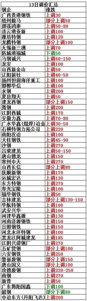 5月13日魯麗廢鋼部分上調150:新料一4060,新料二4010,新料三3890,鋼筋頭4290,重廢3990,中廢3890-3940,統料3800,輕薄料3590,特級破碎料4040,一級破碎4000,二級破碎3880,冷鋼2470,鑄余3710,砣鐵3760,鋼筋壓塊3500,車架子壓塊3000,輕薄料壓塊2900,細粒鋼(燒結用)1280,水洗粒鋼(高爐用)2680,不含稅 。