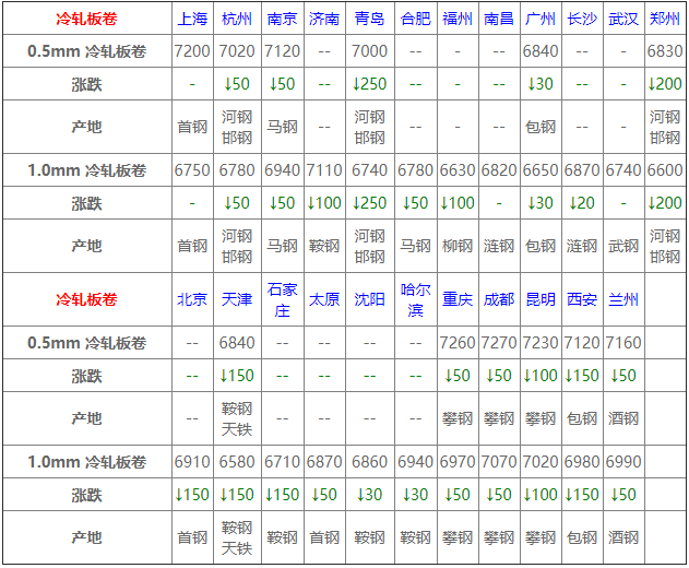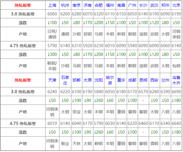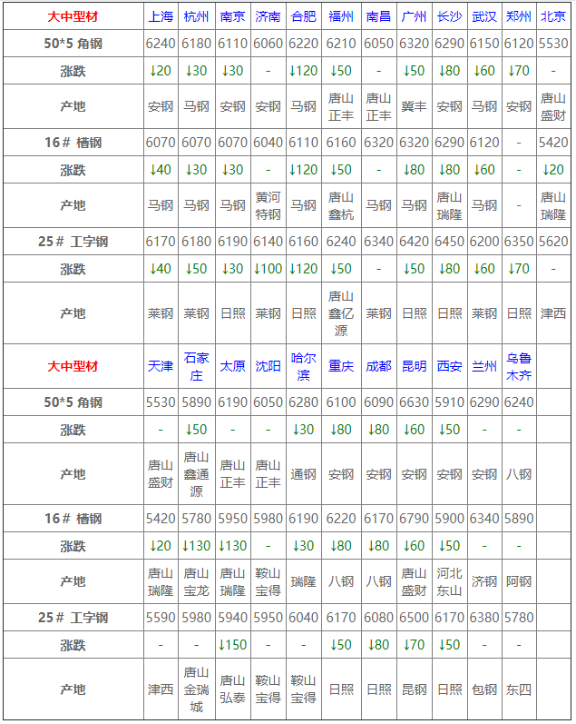 5 5月19日熱帶價格:下行為主; 今全國帶鋼主流下行,華北主導鋼廠降150-180,唐山窄帶累降200,降后低位有所放量,多數一般,個別廠家出清日產,華東華南弱調; 6 5月19日型材價格:繼續走低; 今型價弱勢下行,下游需求跟進遲緩,市場看空情緒明顯,商家補庫操作謹慎,整體成交情況暫無改觀,短期型價將繼續走低。