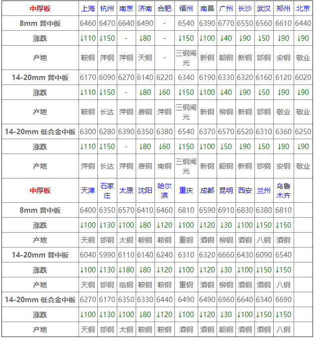 4 5月19日中厚板價格:下調價格; 今全國中板主流下跌,幅度20-200元/噸,成交表現乏力,受期鋼及成本下挫影響,市場恐慌情緒蔓延,盤中持續向弱;