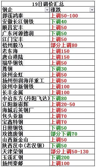 5月19日天津榮鋼部分上調50-130:鋼坯頭,圓鋼頭,火車輪3780,法蘭片3750,弓子板3740,優質一級3780,重a停收,特級破碎料3800,剪切料3250,鐵銷3230,鋼板料一級3780,軋廢3780,鋼筋切粒4100,不含稅