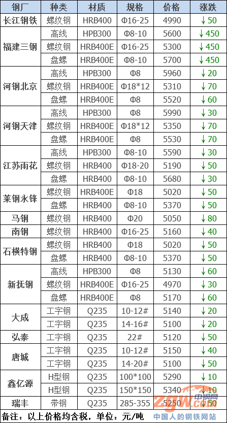 據(jù)不完全統(tǒng)計(jì),今日共30家鋼廠調(diào)價(jià),跌幅最大為福建三鋼建材,調(diào)價(jià)幅度450元/噸,具體調(diào)價(jià)明細(xì)如下: 山西高義建材價(jià)格平穩(wěn) 武安裕華高線價(jià)格平穩(wěn) 山西美錦建材價(jià)格平穩(wěn) 唐山玄龍螺紋鋼價(jià)格平穩(wěn) 河鋼北京建材下調(diào)20-70元/噸 河鋼天津建材下調(diào)30-70元/噸 電力角鋼價(jià)格平穩(wěn) 電力槽鋼價(jià)格平穩(wěn) 宏潤H型鋼價(jià)格平穩(wěn) 弘泰工字鋼下調(diào)50元/噸 大成工字鋼下調(diào)20元/噸 鑫億源H型鋼下調(diào)10元/噸 唐城工字鋼下調(diào)40-50元/噸 天鋼板材價(jià)格平穩(wěn) 普陽中厚板價(jià)格平穩(wěn) 敬業(yè)中厚板價(jià)格平穩(wěn) 瑞豐帶鋼下調(diào)50元/噸 石橫特鋼建材價(jià)格平穩(wěn) 萊鋼永鋒建材價(jià)格平穩(wěn) 江蘇鴻泰螺紋鋼價(jià)格平穩(wěn) 馬鋼建材下調(diào)80元/噸 南鋼螺紋鋼下調(diào)40元/噸 石橫特鋼建材下調(diào)50元/噸 萊鋼永鋒建材下調(diào)50元/噸 長江鋼鐵建材下調(diào)50元/噸 新?lián)徜摻ú南抡{(diào)30-60元/噸 福建三鋼建材下調(diào)450元/噸 江蘇雨花建材下調(diào)30-50元/噸 山東傳洋型材價(jià)格平穩(wěn) 西王特鋼建材價(jià)格平穩(wěn) 下調(diào)15家,占比50%,調(diào)價(jià)幅度10-450元/噸; 平穩(wěn)15家,占比50%。 今日鋼廠價(jià)格延續(xù)下跌走勢,期鋼大幅跳水。礦石方面,近期礦價(jià)連續(xù)下行,除了宏觀強(qiáng)化市場管理等影響,鐵礦石基本面也出現(xiàn)了轉(zhuǎn)弱現(xiàn)象。鋼廠則因鋼價(jià)大幅受挫,利潤快速縮水,對鐵礦的采購積極性降低。市場方面,終端需求不及預(yù)期,交投氛圍較為冷清,商家隨行操作,心態(tài)多謹(jǐn)慎觀望。預(yù)計(jì)短期鋼廠價(jià)格將弱勢調(diào)整。