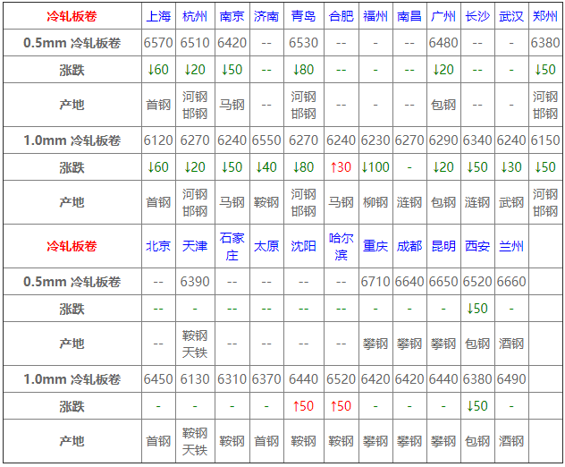 6月1日冷軋板卷價格:下跌為主;