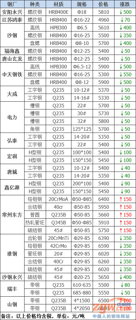 2021年8月9日鋼廠調價通知::大跌400!27家鋼廠最新調價!2021年08月09日