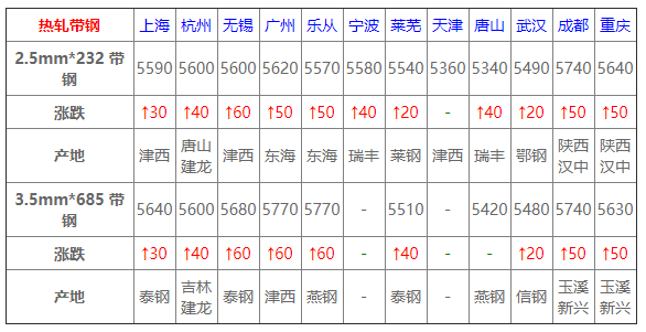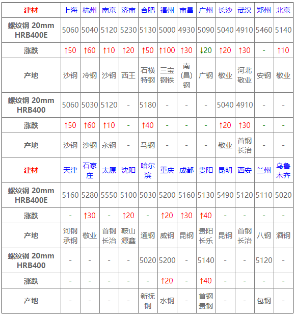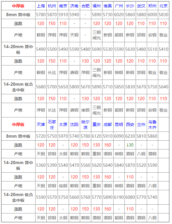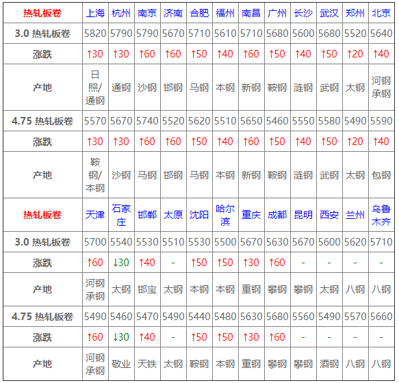 6月10日鋼鐵價格漲跌圖:主流上漲,個別下跌 6月10日建材價格:主流上漲; 今建材整體上漲,市場報價較昨日收盤整體拉漲20-100元/噸,價格上漲,下游整體采購尚可。心態(tài)方面,貿(mào)易商表示端午節(jié)前預(yù)計需求將會小幅釋放,因此節(jié)前價格趨強(qiáng)運(yùn)行; 2 6月10日熱軋板卷價格:上行為主; 今全國熱卷穩(wěn)中偏強(qiáng)運(yùn)行,幅度20-60,期卷持紅上行,提振現(xiàn)貨市場,商戶挺價意愿趨強(qiáng),多以出貨為主,然成交跟進(jìn)不足,市場觀望情緒明顯,預(yù)計短期穩(wěn)中調(diào)整;