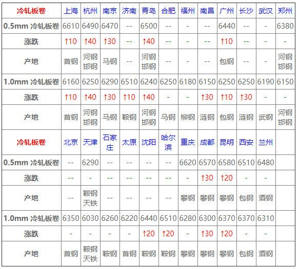 3 6月10日冷軋板卷價格:主流上漲; 今全國冷軋穩(wěn)中偏強(qiáng),幅度10-40,相關(guān)期貨拉漲,提振冷軋現(xiàn)貨市場,商家操作出現(xiàn)分歧,部分庫存承壓,以出貨為主,挺價意愿不強(qiáng),成交可優(yōu)惠,然終端需求釋放不足,觀望情緒較濃,市場實(shí)際成交一般;