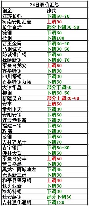 6月24日四川都鋼鋼鐵公司下調(diào)30:生鐵3110元;重廢8厘3360、6厘3330、中廢5厘3290、4厘3260、3厘3180、2厘3060-3110,不含稅。