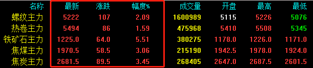 今日期鋼拉漲,鐵礦石領漲黑色系,期螺上漲107收報5222,期卷上漲86收報5494,鐵礦石上漲64收報1225,焦煤上漲58.5收報1970.5,焦炭上漲89.5收報2681.5。