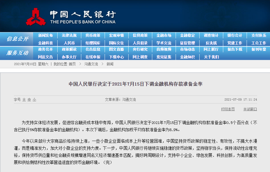 繼7月7日國常會釋放“降準”信號之后,7月9日央行正式宣布全面降準。人民銀行決定于7月15日下調金融機構存款準此次全面降準將釋放長期資金1萬億元備金率0.5個百分點(不含已執行5%存款準備金的金融機構)。主要目的是緩解市場流動性壓力,尤其是針對此前大宗商品價格持續上漲帶來的小微企業經營困難問題。