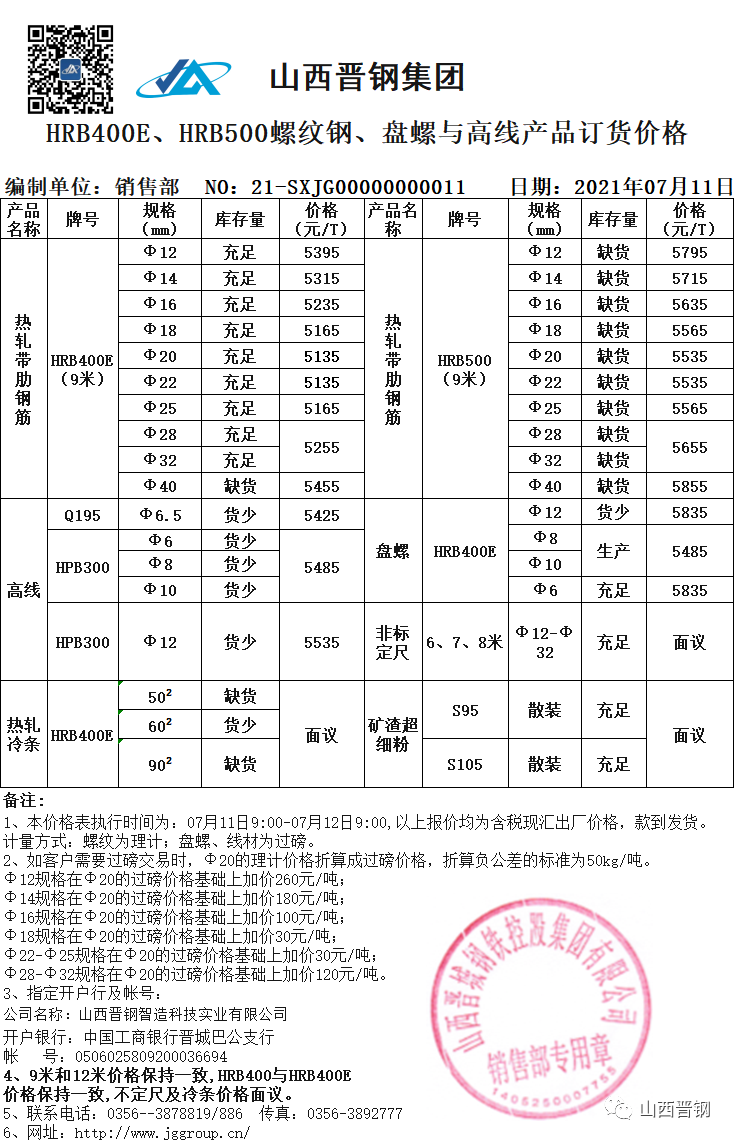 【合肥馬鋼】11日馬鋼建材漲40元。合肥倉庫提貨抗震螺紋5310元/噸,線材5660元/噸,盤螺5690元/噸;馬鞍山倉庫提貨抗震價格:螺紋5300元/噸,線材5650元/噸,盤螺5680元/噸。 【安陽沙鋼】11日調(diào)整信息:2021年7月第2期HRB400E螺紋鋼以∮18為基礎價格,在7月1期價格基礎上上調(diào)130元/噸。12mm加220元/噸,14mm加160元/噸,16mm加80元/噸,20-22mm加價30元/噸,25mm加60元/噸,28-32mm加100元/噸,36-40mm加200元/噸。 【首鋼長鋼】11日首鋼長鋼價格調(diào)整信息:從9時起,對螺紋鋼、理計光圓鋼筋、盤螺、線材、普圓、碳圓、錨桿鋼、型鋼價格統(tǒng)一上調(diào)50元/噸,結算以電商系統(tǒng)中實提時間為準。 【山西建邦】11日山西建邦建材出廠價螺紋、盤螺、線材漲50:螺紋5100元/噸,盤螺5400元/噸,線材5400/噸。 【河南濟鋼】11日河南濟鋼集團對建材產(chǎn)品價格調(diào)整如下:1、棒材螺紋價格上調(diào)80元/噸;2、建筑用盤圓、盤螺價格上調(diào)80元/噸。 【連云港亞新】7月11日起,連云港亞新廢鋼漲30元。一、鋼板料,模具鋼,價3580;二、12毫米厚優(yōu)質重廢A,價3550;三、6毫米厚重廢B,價3460,四、4毫米厚中廢新料,價3330-3380。(單位:元/噸) 【郎溪鴻泰】7月11日,郎溪鴻泰廢鋼碎刨花漲30元。機生鐵3590,重廢3520,中廢3470,剪料3270,碎刨花3180-3210,鋼筋壓塊3590。要求生鐵重廢中廢到廠驗-貨為準圍邊嚴格要求80以內(nèi)密封件一律重罰刨花參假罰款3-10萬。(單位:元/噸) 【廣西梧州毅馬】7月11日起,梧州毅馬廢鋼部分漲20元。鋼筋沖粒3650,新鋼板料3650,模具鋼3650,熱軋沖子、冷軋沖子、汽車沖片3650,機生鐵3630,鋼筋頭、汽車大梁、前后橋3570,熱、冷軋沖片3610,硅鋼片3650,風割料3570,一級剪切料3540,二級剪切料3350,不含稅。(單位:元/噸) 【海城后英鋼廠】7月11日起,海城后英鋼廠廢鋼價格漲60元。純8厚以上3560,600/800尺寸,生鐵鋼件不要。(單位:元/噸) 【河南舞鋼】7月11日起,零時起河南舞鋼重型廢鋼漲80元,執(zhí)行4020元,中型廢鋼漲80元,執(zhí)行3930元,小型廢鋼漲80元,執(zhí)行3840元,輕薄料漲80元,執(zhí)行2920元,普通破碎料漲80元,執(zhí)行3980元,優(yōu)質破碎料漲80元,執(zhí)行4040元,單裝單發(fā)機生鐵漲60,執(zhí)行3970。 【湘潭郭建武】7月11日起,湖南湘潭郭建武最新廢鋼接貨價:特級壓塊3520,一級壓塊3460,二級壓塊3400,三級壓塊3240,四級壓塊3180,優(yōu)剪3500,重廢3400-3450,統(tǒng)料3220,輕薄料3040。 【鄭州福華】7月11日起,福華廢鋼價格漲30元。新純鋼板料3430,重廢一3430,重廢二3380,鋼筋頭3430,剪切一級3330,二級3260,三級3160,一級生鐵鋼件3380,鐵銷一級3310,二級3260,長銷3180。(單位:元/噸) 【福建新吳航】7月11日起,福建新吳航:所有廢鋼漲50元。(單位:元/噸) 【福建老吳航】7月11日起,福建老吳航省內(nèi)外所有廢鋼料型漲50元。(單位:元/噸) 型管帶鋼 今日鋼市繼續(xù)偏強運行,高位成交有所放緩。今晨鋼坯出廠漲30至5130含稅,唐山鋼坯倉儲現(xiàn)貨含稅5260,直發(fā)走量一般。唐小窄帶漲50-100,主導廠5470部分資源5490含稅出廠。唐355系列帶鋼較昨午前漲30,宏興期現(xiàn)資源5250未含稅。鋼廠唐瑞豐漲100,津西漲80-100。型鋼主穩(wěn),角鋼部分漲30,高位成交緩,現(xiàn)5-6.3角5450-5470,8槽5480,14-20工5440-5460;鋼管方面,主流上漲50,成交多觀望。 結構鋼 周末結構鋼市場積極拉漲,成交跟進一般。山東結構鋼大戶直發(fā)趨強:萊鋼30-119暫參考報5350,西王50-105mm報5300-5320,廣富中棒5390,魯麗5220,萊蕪FL5320,濰鋼28-60待政策暫參考基價5220,青鋼參5350,江鑫參5320。部分合金原料價格上漲增加成本支撐,且逢旬度調(diào)價,部分鋼廠指導價格上調(diào),市場氛圍受到帶動,整體漲價顯積極。考慮到價格上調(diào)過后終端跟進暫不理想,增加業(yè)者觀望心態(tài),而庫存下滑增加供應端支撐,多空博弈下現(xiàn)貨市場觀望整理運行。(單位:元/噸) 板材 今日板材市場漲勢略趨緩,部分主流資源繼續(xù)小漲。唐山熱軋漲20,4.5-11.5安豐燕鋼開平5720卷減10,2.0加240,2.75加90,3.0加30,錳加150。泰安熱軋漲10,普碳4.75mm*1500mm*C報5770,2.75報5940,3.0報5920;錳5950。唐山中板漲10,14-30報5490,8報5900貨少,12報5590;10報5670,錳5690。市場商家多積極關注下周資本市場表現(xiàn),下游接單不一。