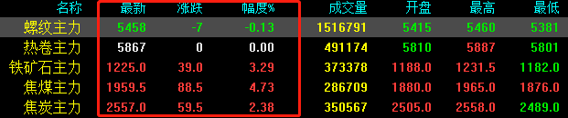 今日期鋼震蕩調整,期螺收盤下跌7報5458,期卷持穩報5867,鐵礦石上漲39收報1225,焦煤上漲88.5收報1959.5,焦炭上漲59.5收報2557。
