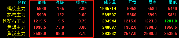 期鋼今日拉漲,期螺上漲155收報5580,期卷上漲152收報5999,鐵礦石上漲9.5收報1219.5,焦煤上漲73收報1996.5,焦炭上漲68收報2589。