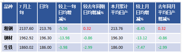 根據中鋼協最新數據來看,7月上旬粗鋼、鋼材、生鐵日均產量環比均較上一旬有所下降,其中粗鋼日均產量降幅5.56%,鋼材日均產量環比下降13.98%,生鐵日均產量環比下降3.98%。與此同時,從與去年同期相比,僅粗鋼小幅增加0.32%,鋼材和生鐵日均產量均有回落。7月作為下半年的開局,也是傳統淡季,鋼產量的回落有助于支撐鋼價走勢。