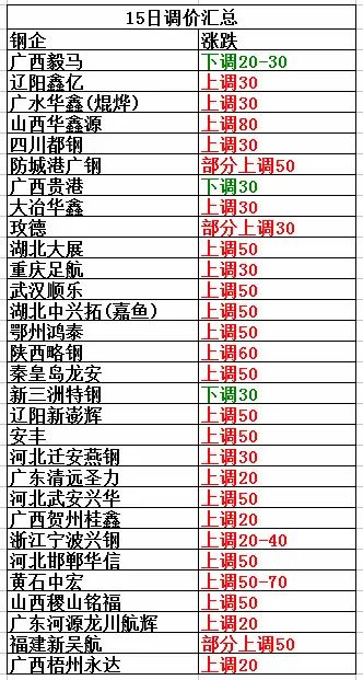 7月15日河北遷安燕鋼上調30:優質3810,優質一3800,重型一3810,重二3790,重A3770,重B3710,重C3670,中A3730,中B3650,中C3610,小型3365,統料3065,優質鑄鐵3650,普通鑄鐵3450,一級剪切料3570,二級剪切料3530,三級剪切料2980,不含稅。
