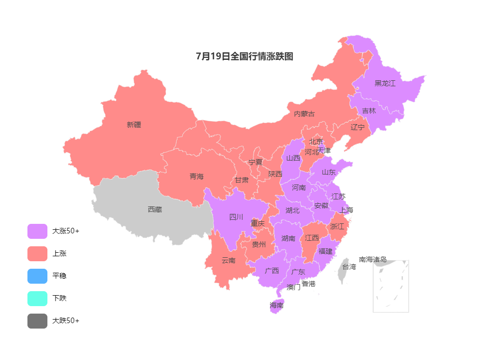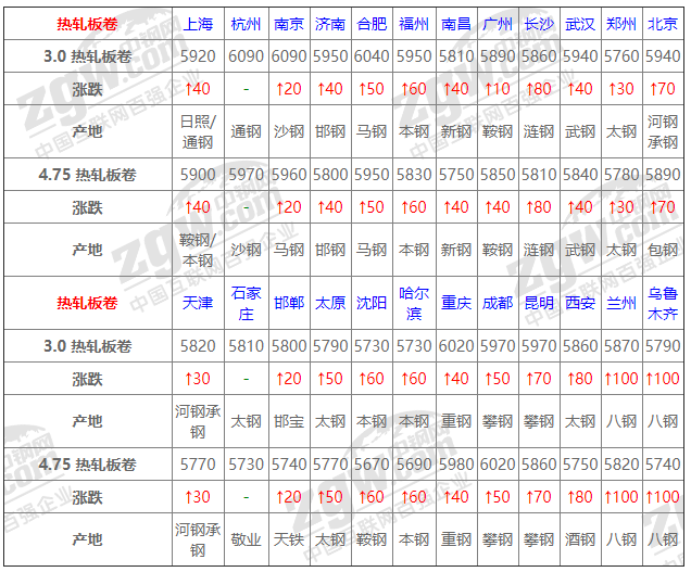 7月19日鋼鐵價格漲跌圖:主流上漲 7月19日建材價格:穩中上漲; 今建材穩中上漲,幅度40-100,周五夜盤期螺走勢強勢拉漲且今日尚可,受此影響今日建材價格走勢均大幅補漲,然而市場成交不佳,預計建材價格盤整為主; 2 7月19日熱軋板卷價格:上行為主; 今全國熱卷上行為主,幅度20-100,市場補漲周末為主,早上市場出貨偏弱,高位成交乏力,部分地區價格小幅回調,整體交投顯弱;