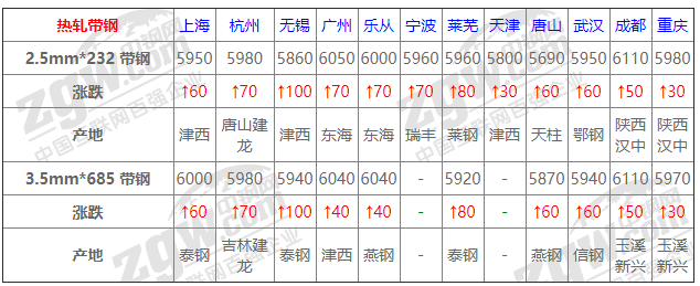 今全國熱帶價格小幅上漲運行,幅度30-100左右,市場僅低位資源成交尚可,高位仍舊乏力,商家多挺價心理,考慮上游帶鋼價格上移,預計明或高位整理;