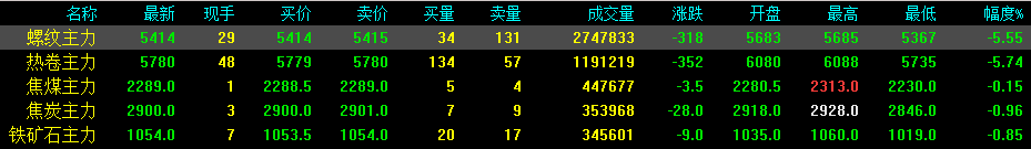 今日螺紋主力期貨收盤價(jià)5414,跌318點(diǎn),跌幅5.55%;熱卷主力期貨收盤價(jià)5780,跌352點(diǎn),跌幅5.74%;鐵礦石期貨收盤價(jià)1054.0,跌9點(diǎn),跌幅為0.85%。