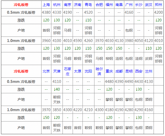 今冷軋市場下跌為主,本鋼資源領跌,有些入庫有些靠港,壓力較大,且臨近月底,資源仍較緊張,商家不得以出庫。據了解,近期期貨盤面震蕩,市場恐慌情緒較濃,操作上多以低價出貨套現為主,緩解資金壓力降低風險。低價資源刺激有一定的效果,場內大戶一些資源有售罄情況,但多數不太理想不及預期,大戶日均出貨量僅達6-7成水平左右,中小戶甚至4-5成水平。心態方面,多數貿易商情緒悲觀,對后市不是很看好。綜合考慮,預計短期冷軋卷板價格弱勢難改。