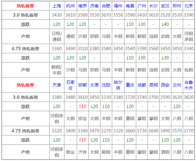 今日熱軋市場主流下行,現主流規格售價在3430-3450元/噸。從了解的情況看,期螺開盤向下,拖累現貨市場操作情緒,貿易商心態偏空,市場低價資源增多,但下游采購積極性不高,整體成交氛圍一般偏淡,綜上所述,故預計短期熱卷價格或出貨為主。