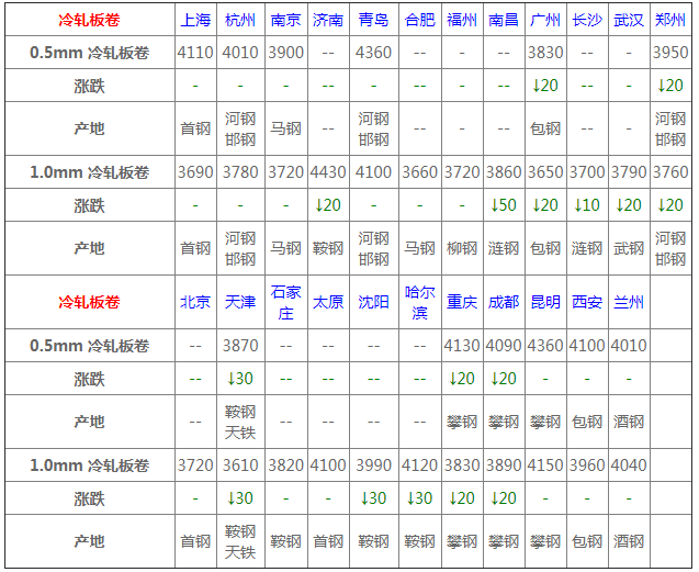 今日市場偏弱為主,本鋼資源小跌10元,鞍鋼回落10-20元,武鋼產品1.5規格相對主流,整體需求近兩日均不如人意。據了解,由于上兩周現貨價格已經達到超跌的水平,商家噸鋼虧損達到400-500元/噸,因此盤面上漲的情況下,近期現貨價格出現止跌,甚至拉漲了50-60元;但由于全球疫情依舊嚴重,對于后期冷軋出口轉為內貿的壓力表示擔憂,因此現貨價格并未出現明顯的反彈。綜合考慮,預計市場短期冷軋卷板價格穩中盤整。