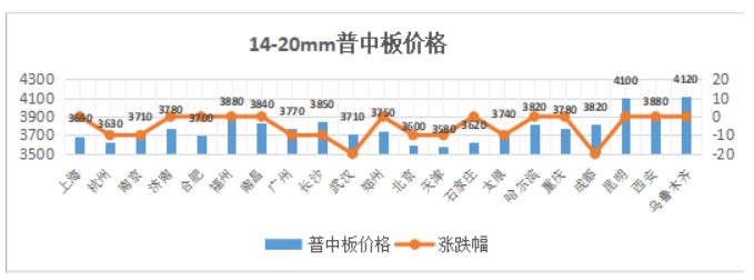 【中板】中板跌幅10-20,全國21個(gè)主要市場14-20mm普中板平均價(jià)格3780元/噸,較上個(gè)交易日下調(diào)5元/噸。