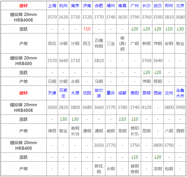 螺紋鋼24個市場中10個市場下跌10-30,1個市場上漲10, 20mmHRB400E平均價格3756元/噸,較上個交易日下調7元/噸;