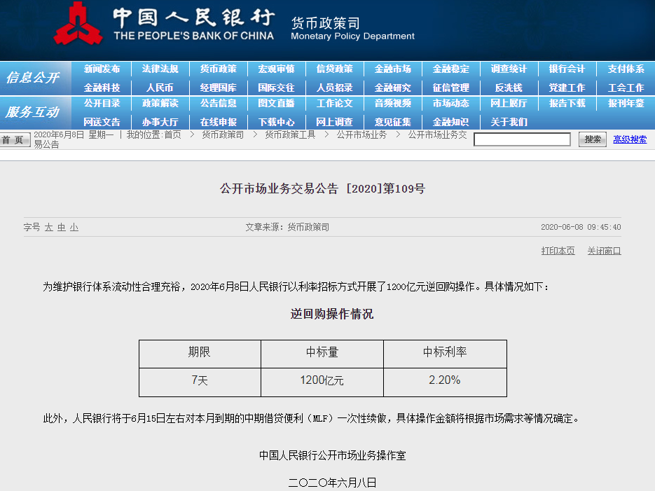 本周一有5000億元MLF到期,周四有700億元逆回購到期,周五有1500億元逆回購到期。共計7200億元巨量資金到期,為緩解市場流動性壓力,央行今日開展1200億元逆回購操作,此外,人民銀行將于6月15日左右對本月到期的中期借貸便利(MLF)一次性續(xù)做,關注利率變動。
