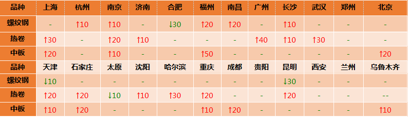 螺紋鋼24個市場中5個市場上漲10-20,2個市場下跌10-30,20mmHRB400E平均價格3805元/噸,較上個交易日價格相同;