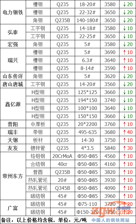 統(tǒng)計的35家鋼廠調價中,漲幅最高為瑞豐帶鋼,調價幅度40元/噸,跌幅最大為山東傳洋型材,調價幅度20元/噸,具體調價明細如下: