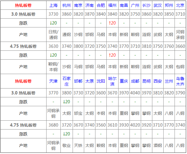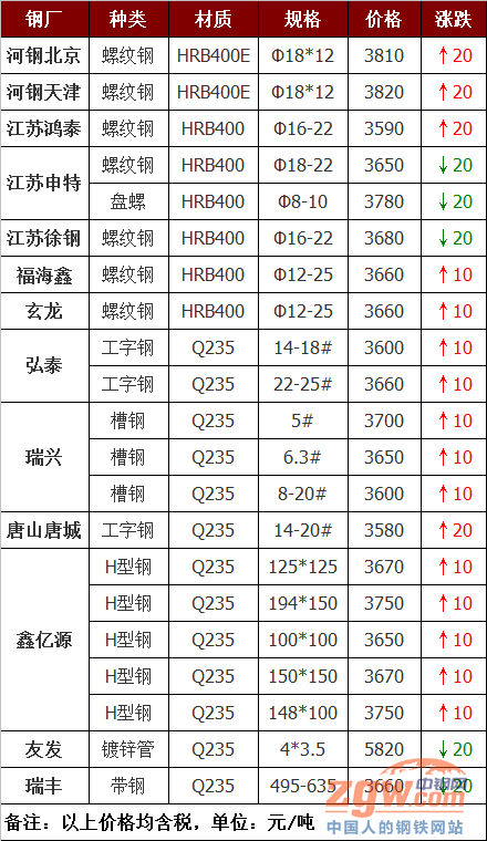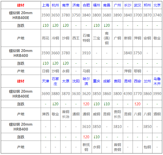 今日統計的21家鋼廠調價中,漲幅最高為河鋼北京建材,調價幅度20元/噸,跌幅最大為江蘇徐鋼建材,調價幅度20元/噸,具體調價明細如下:
