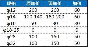 原加價φ12、φ14加200,φ16加50,φ18-25作為基價,φ28、φ32加100,現φ12加260、φ14加180,φ16加80,φ28、φ32加150,相當于在φ12、φ14在原基礎上補加60,φ16補加30,φ28、φ32補加50!