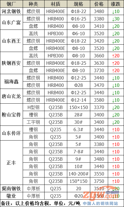 今日鋼廠出廠價格主流穩定,少數小幅波動,華北華南地區出貨量小幅下降,鋼廠多穩定,華東鋼廠調價意愿不大,山東地區受庫存影響,上下略有變化,西部地區本周庫存降速呈板快建慢現象,預計整體明日鋼廠價格小幅震蕩運行。據中鋼網(微信公眾號:中鋼網)數據監測,今日共36家鋼廠調價,其中最高漲幅為陜鋼西安,調價幅度20元/噸,最大跌幅為廣富碳結鋼,調價幅度50元/噸,具體調價明細如下: