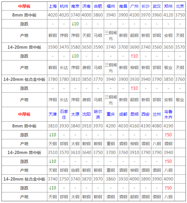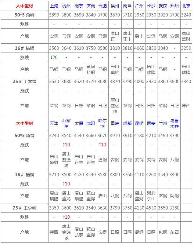 華北地區調價 山西建龍建材價格平穩 山西立恒建材價格平穩 唐山玄龍螺紋鋼下調10元/噸 唐山福海鑫螺紋鋼下調10元/噸 河北鋼鐵建材價格下調10元/噸 宏強角鋼價格平穩 鑫杭槽鋼價格平穩 瑞興槽鋼價格平穩 歐聯槽鋼價格平穩 電力鋼鐵型材價格平穩 正豐角鋼上調10元/噸 天鋼板材價格平穩 元寶山板材價格平穩 普陽中厚板價格平穩 敬業中厚板下調10元/噸 冀鋼中厚板下調20元/噸 華東地區調價 南鋼建材價格平穩 馬鋼建材價格平穩 山東廣富建材價格平穩 石橫特鋼建材價格平穩 濟鋼閩源建材價格平穩 方大特鋼建材價格平穩 江蘇雨花建材價格平穩 長江鋼鐵建材價格平穩 江蘇徐鋼建材價格平穩 萊鋼永鋒螺紋鋼價格平穩 山東西王建材下調20元/噸 山東廣富建材下調20-30元/噸 廣富碳結鋼下調50元/噸 山東傳洋型材價格上調10元/噸 其他地區調價
